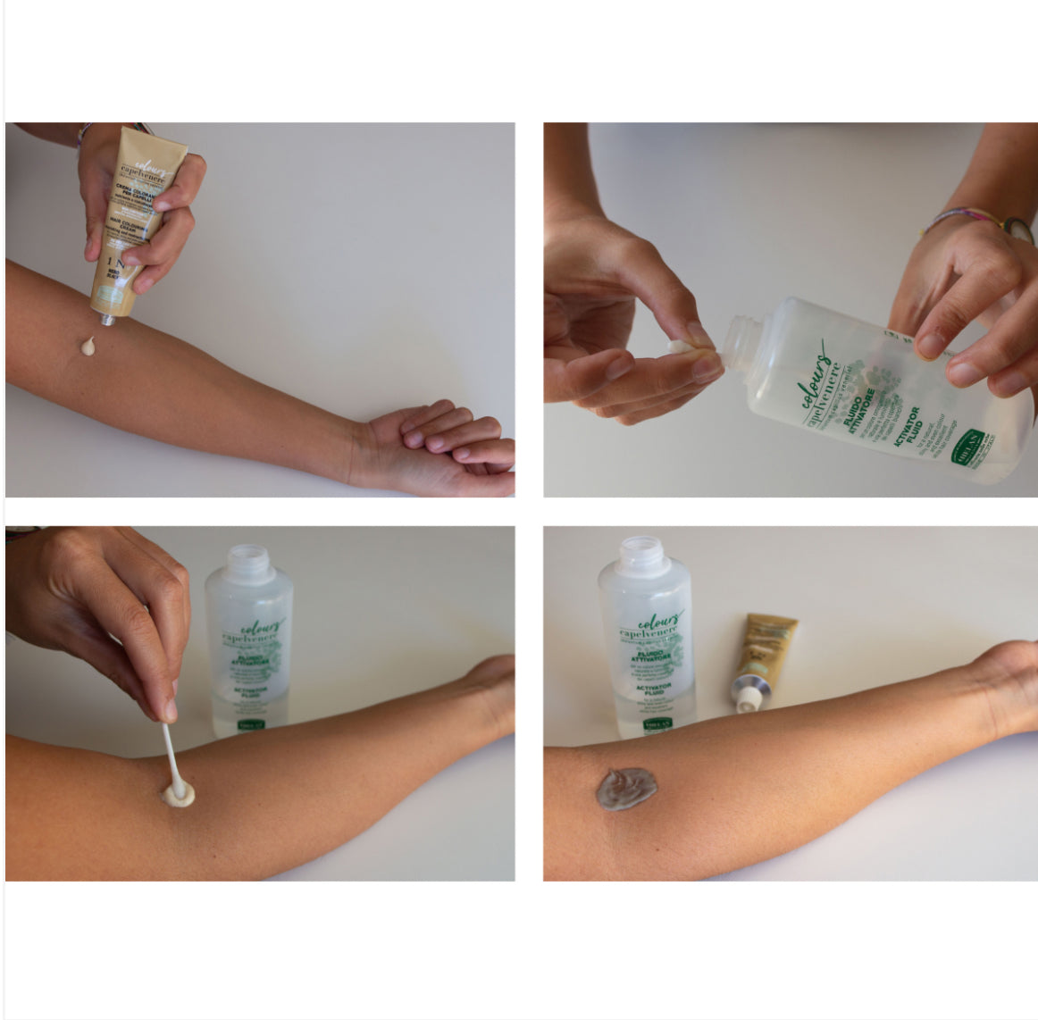 - applicare una piccola quantità della Crema Colorante con eguale quantità di Fluido Attivatore, nell’incavo del gomito o dietro l’orecchio, sufficiente a coprire una superficie di dimensioni di circa 1cm quadrato. Ripetere l’operazione 2 o 3 volte lasciando asciugare nell’intervallo. Richiudere bene sia il tubo della crema colorante che il flacone del fluido attivatore. Aspettare 48h senza lavare, coprire o toccare.