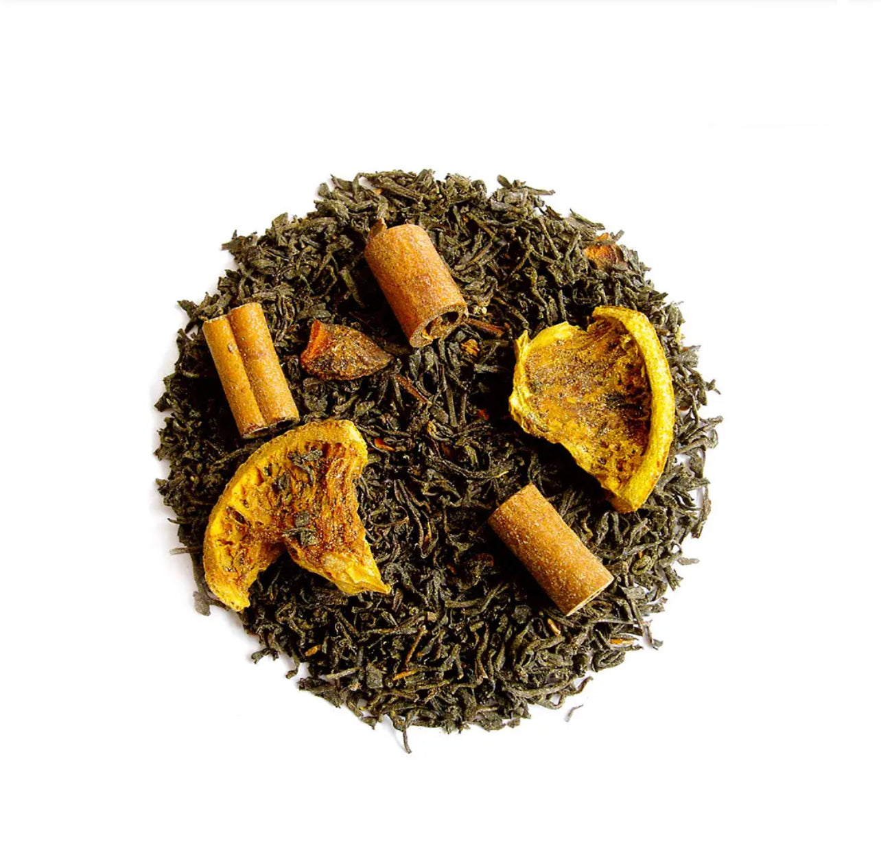 Tè nero (72%), scaglie di cioccolato (zucchero, scaglie di massa di cacao, polvere di cacao, agente emulsionante: LECITINA DI SOYA) (6%), scorze d’arancia, anice stellato (6%), pezzi di cannella (6%), anice stellato in scaglie, aromi.