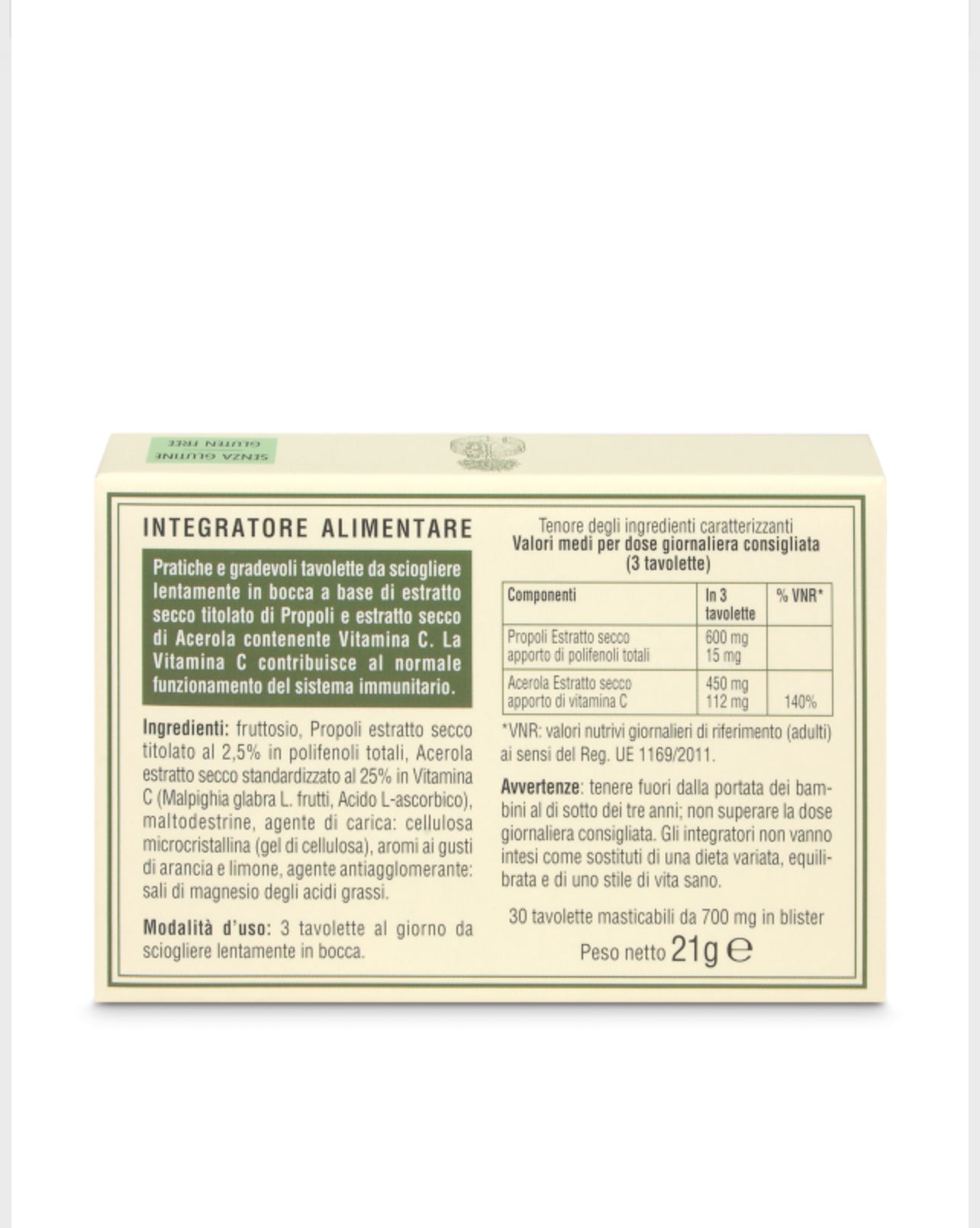 Pratiche e gradevoli tavolette da sciogliere lentamente in bocca a base di estratto secco titolato di Propoli e estratto secco di Acerola contenente Vitamina C. La Vitamina C contribuisce al normale funzionamento del sistema immunitario.